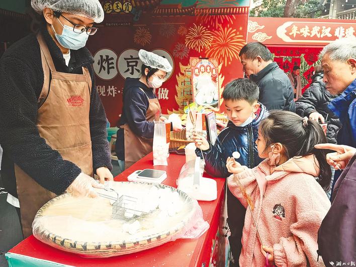 年味,最直接的體驗就是美食的味道。汪玉霞現(xiàn)炸京果攤前排起了長隊。“能嘗一個不?”“來來來,嘗一個,不酥不要錢啊!”炸京果的師傅熱情地招徠顧客,“我們的京果酥、脆、甜、香,每一口都是年的味道。”進了臘月,汪玉霞現(xiàn)炸京果攤就在吉慶街擺開了,“估計要開到正月初十,好多老顧客就是要買現(xiàn)炸的京果。”店員介紹說,每天要賣出去5000到6000元的京果。汪玉霞店鋪里也是人頭攢動,“我要兩包雜糖、兩包花生酥。”“那個元寶盒子里是雪花酥吧,拿四個。”湖北日報全媒記者注意到,店里顧客說武漢話的居多,店員介紹說,臨近過年,本地顧客居多,春節(jié)期間就是外地游客多了。