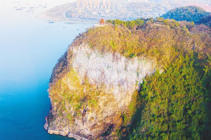 寒冬時節,黃石長江段,西塞山直聳江心,170多米高的臨水崖壁猶如“殘雪”,一幅詩畫山水躍然眼前。 (湖北日報全媒記者 薛婷 通訊員 周巍 攝)