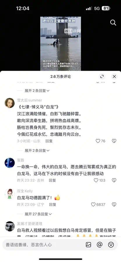 極目新聞各平臺報道后,記者在各平臺的留言區,看到不少網友表示難過,更有不少網友則寫下七律悼義馬白龍。同時,還有不少網友表示,應該為白龍馬在江邊立一座雕像,讓白龍馬的義勇精神更多人知道。