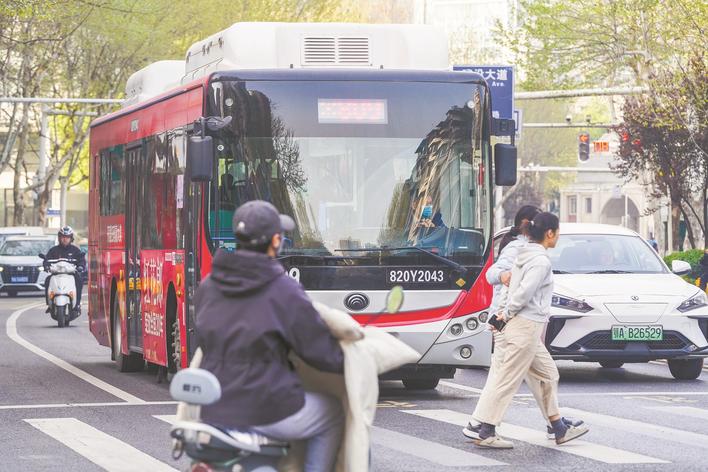 公交車禮讓斑馬線 楚天都市報極目新聞記者鄒斌攝