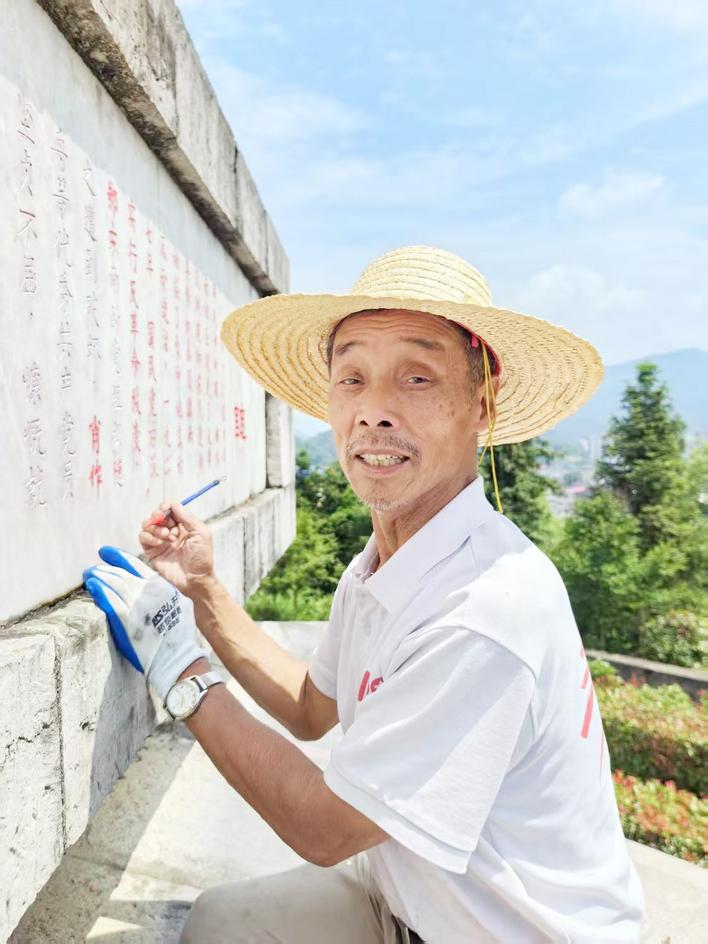 “有的墓碑上的字看不清,來瞻仰烈士的人們就會問我。”舒在則說,除了這次,他也經常不定期描字,哪里看不清楚他就描哪里。2017年,他還自費三千多元請人搭了架子,給十幾米高的紀念碑描字,描正下方文字時,他站也不是、跪也不是,貓著腰,一干就是三四個小時。