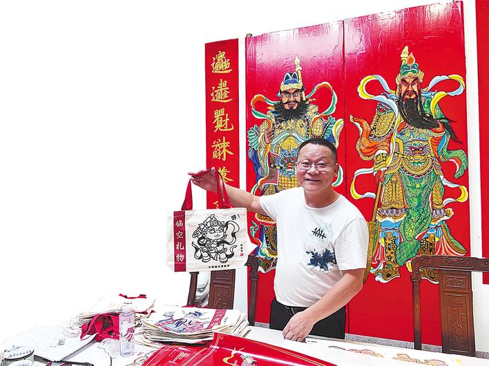 “年輕人不是不喜歡傳統,而是需要符合當代審美和傳播方式的文化產品。”許華波強調。如今漢吉福團隊平均年齡不到30歲,他們以創新思維打破年畫僅在春節銷售的局限,開發出合體貼字、門神帆布包、發財文創扇等衍生產品,并針對城市住宅單門結構推出專用年畫,進一步拓寬使用場景與消費人群。目前,他們通過抖音運營十余個賬號,日均發貨超千單,產品銷往山東、廣東、河南等地,甚至通過外貿公司間接出口至海外市場,成為華人家庭春節時的“鄉愁寄托”。