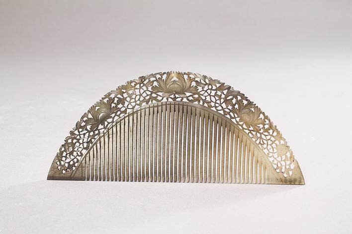 “香噴瑞獸金三尺,人插云梳玉一彎”,江蘇南京南宋墓出土的半月形薄片玉梳,和田玉質地,梳齒制作規整,梳背上采用透雕工藝細致雕琢出三朵盛開的牡丹和兩朵待放的花苞,間以細密的纏枝,雕工精湛,構圖雅致,代表了南宋時期江南地區卓越的治玉水平,直觀展現了辛棄疾筆下女性插梳的美好形象。