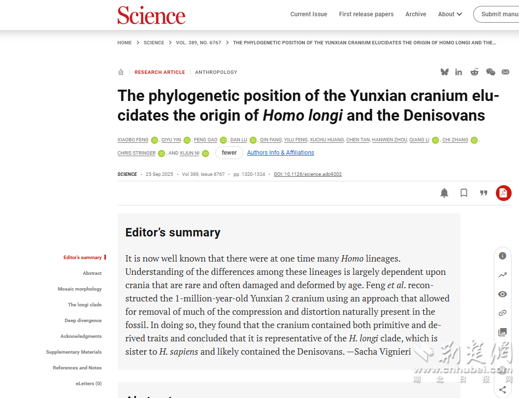 北京時間2025年9月26日凌晨2點,國際權威學術期刊《科學》(Science)發表了題為《“鄖縣人”頭骨的系統發育定位揭示龍人與丹尼索瓦人的起源》的研究論文。該研究由山西大學、中國科學院、云南省文物考古研究所、湖北省文物考古研究院、武漢大學、十堰市博物館、保利藝術研究院、中國地質大學(武漢)和英國倫敦自然歷史博物館等單位的專家學者合作完成。長江文化研究院特聘研究員馮小波教授為論文第一作者,學術委員會委員方勤研究員等為共同作者。