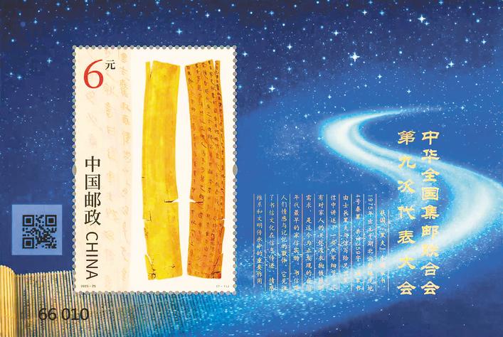 此次發行的郵票主圖,選用湖北云夢睡虎地秦墓出土、現藏于湖北省博物館的戰國“黑夫”木牘家書。該木牘1975年出土于睡虎地4號秦墓,是目前考古發現的最早家書實物。該家書由士兵黑夫與驚寫給兄長衷,信中講述了一些從軍細節,還有對家人的關懷及衣物錢糧的需求。郵票邊飾背景中展開的竹簡似一條時光長河,在象征中華文明的浩瀚星空里蜿蜒伸展,穿越千年、對話古今,蘊含著中華文明在傳承中創新、在創新中發展的理念。